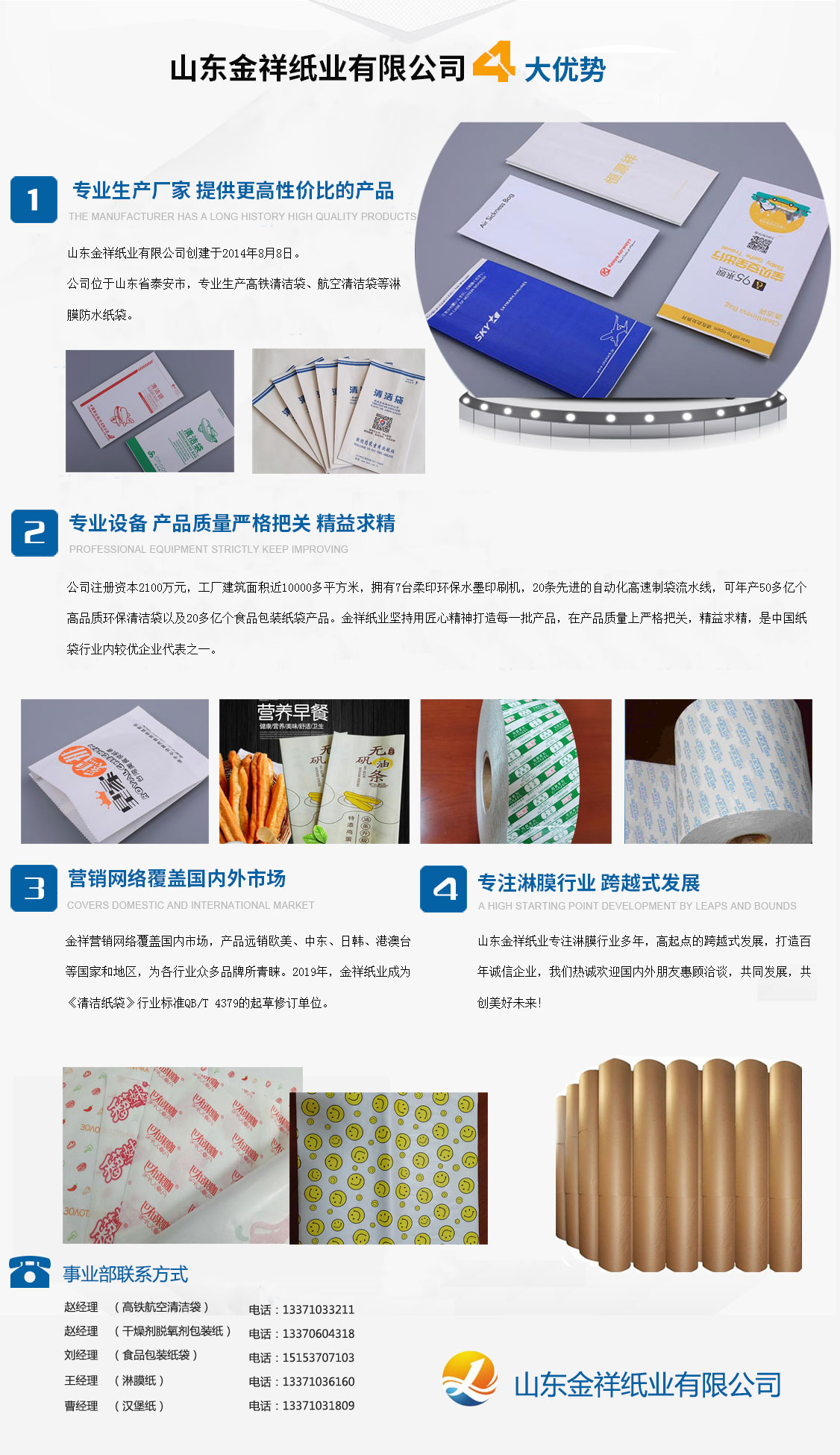 山東金祥紙業(yè)有限公司創(chuàng)建于2014年8月8日,公司位于山東泰安,專業(yè)生產(chǎn)高鐵清潔袋、航空清潔袋等淋膜防水紙袋。公司注冊資本2100萬元,工廠建筑面積近10000多平方米,擁有7臺柔印環(huán)保水墨印刷機,20條先進(jìn)的自動化高速制袋流水線,可年產(chǎn)50多億個高品質(zhì)環(huán)保清潔袋以及20多億個食品包裝紙袋產(chǎn)品。金祥紙業(yè)堅持用匠心精神打造每一批產(chǎn)品,在產(chǎn)品質(zhì)量上嚴(yán)格把關(guān),精益求精,是中國紙袋行業(yè)內(nèi)較優(yōu)企業(yè)代表之一。金祥營銷網(wǎng)絡(luò)覆蓋國內(nèi)市場,產(chǎn)品遠(yuǎn)銷歐美、中東、日韓、港澳臺等國家和地區(qū),為各行業(yè)眾多品牌所青睞。2019年,金祥紙業(yè)成為《清潔紙袋》行業(yè)標(biāo)準(zhǔn)QB/T 4379的起草修訂單位。